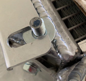 Step in the second challenge. As mentioned above the female side of each bobbin is secured onto existing bolts present on the radiator. Two of those bolts, the two lower ones need to be installed. Now all four need to be cut to length which I'll discuss shortly. The bottom two bolts should be cut before inserting through the bracket otherwise it's not possible to fit them. Each cut bolt is inserted from behind the bracket, via the edge of the end tank so that the bolt head sits behind the bracket. It is a tight fit and requires careful positioning of the bolt head. I removed the lower bolts from my existing radiator to avoid having to cut a new set. I managed to fit one of the lower bolts, however it was simply impossible to fit the second. There wasn't clearance between the end tank and its welds for the bolt head. Try as I may it just wouldn't fit. I'm sorry to say another quality assurance issue from Caterham Cars, they need to get a handle on this stuff.
